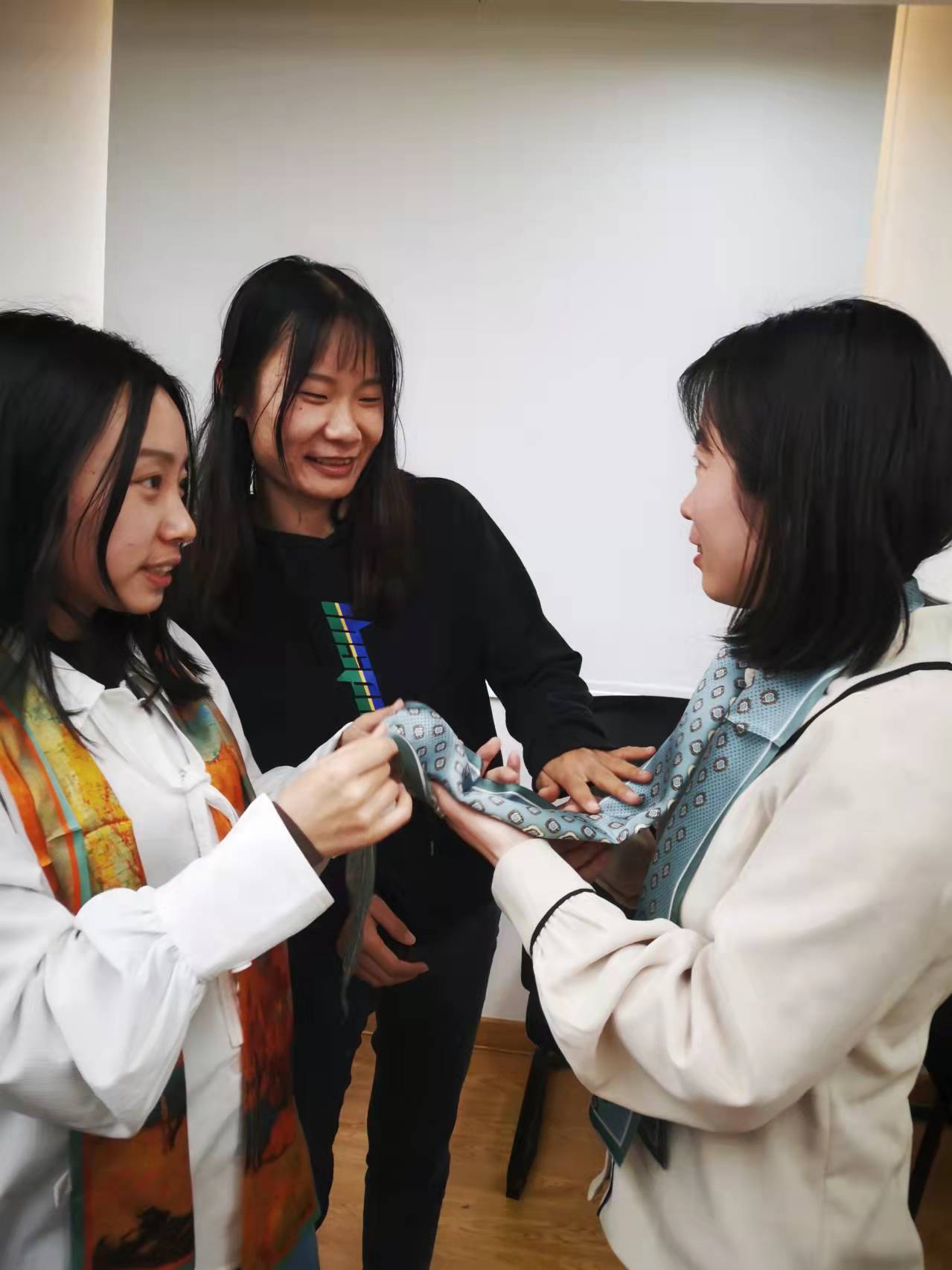 大家快樂地打開“絲巾”盲盒后,一起學習了多種系絲巾方法。大家享受著搭配色彩、設計造型、相互系絲巾帶來的樂趣和美好體驗,展示著各自的才藝。